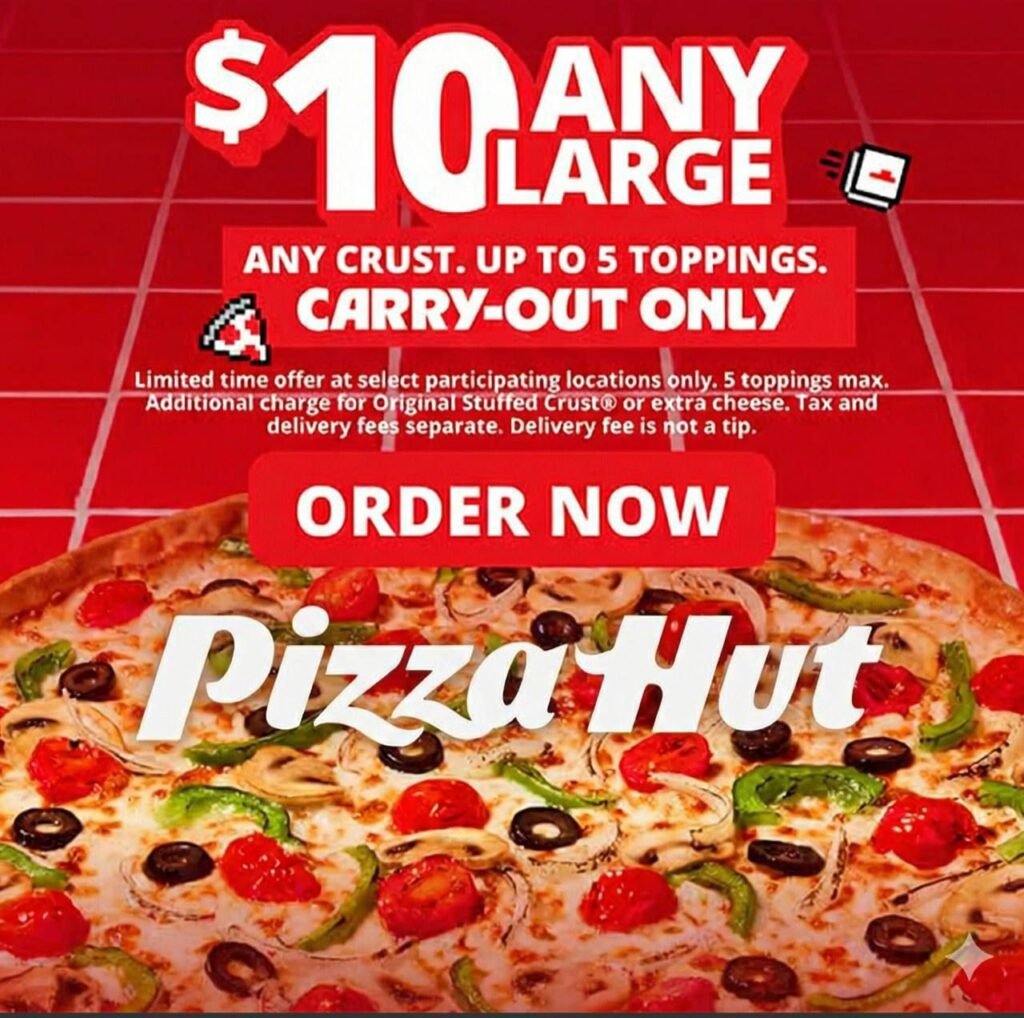 If you’re planning a budget-friendly pizza night, this limited-time offer from Pizza Hut is one to grab. For just $10, you can score any large pizza with up to five toppings. That means you can fully customize your pie without paying extra for each topping. Whether you love it loaded with meats, packed with veggies, or a mix of both, this deal makes it easy to upgrade dinner without overspending.