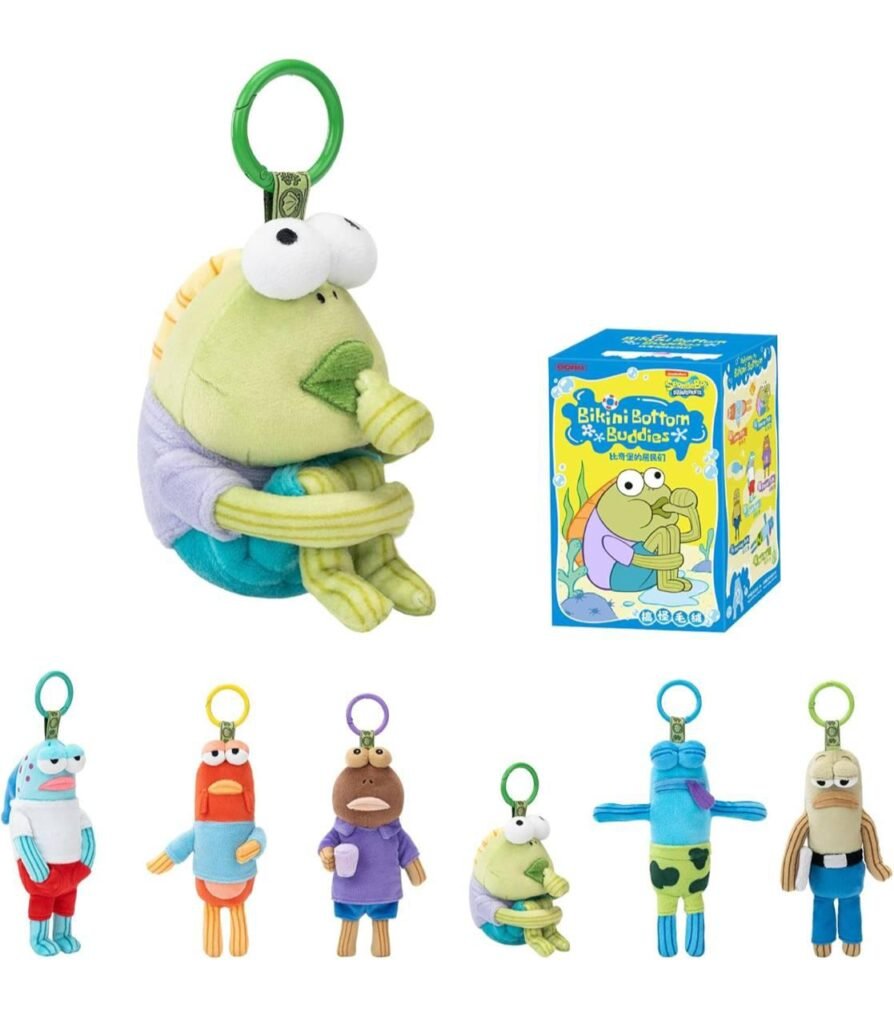 • Features whimsical character-inspired plush figures from Bikini Bottom