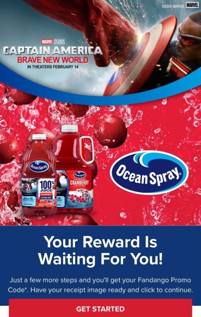 Purchase two participating Ocean Sprays and upload your receipt to get a $10 Fandango Promo Code