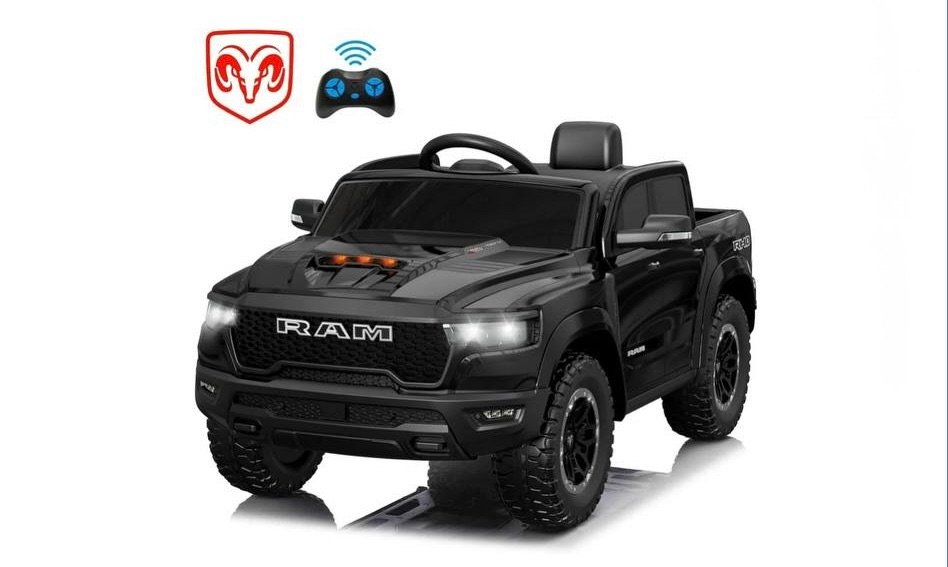 $189.99 RAM 1500 Ride on Car Toy for Kids, 12V Powered Ride on Truck Toy with Remote Control, 4 Wheel Suspension, Safety Belt, Music, Bluetooth, LED Lights
