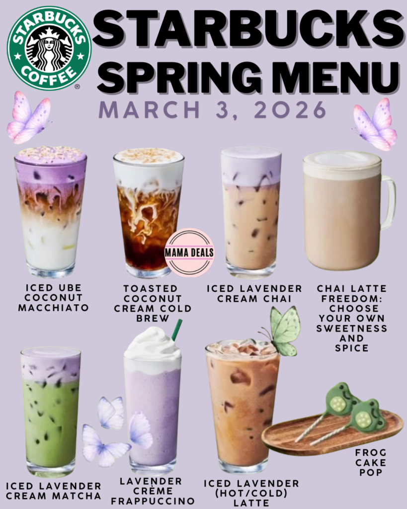Iced Ube Coconut Macchiato Toasted Coconut Cream Cold Brew Iced Lavender Cream Chai Iced Lavender Cream Matcha Lavender Crème Frappuccino Iced Lavender Latte (available hot or iced) Chai Latte (customize your sweetness and spice level) Frog Cake Pop (limited-time spring treat)