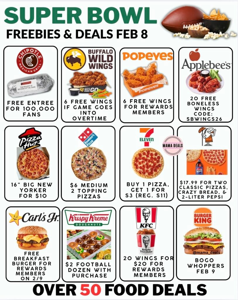 Super Bowl Sunday is one of the biggest food deal days of the year, and 2026 is packed with freebies, BOGO offers, and app-exclusive steals. From free wings and pizzas to discounted party bundles and rewards-only promos, restaurants are rolling out limited-time Super Bowl deals you don’t want to miss. Below is a full breakdown of the top Super Bowl food deals, plus important tips so you don’t miss out.