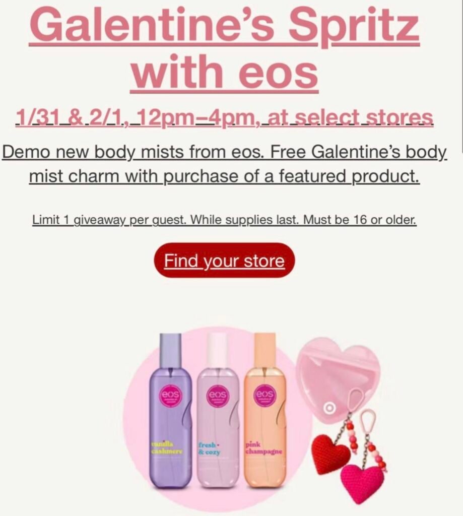 If you love Target freebies, beauty events, eos products, or Valentine’s Day deals, this Galentine’s Spritz event is definitely worth checking out.