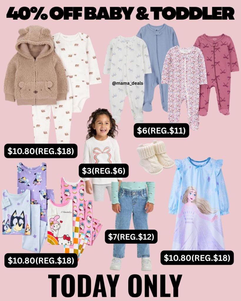 Target is offering 40 percent off toddler and baby clothing today, including deals on sleep n’ plays, pajamas, nightgowns, sets, denim, slippers, and more. Highlights include $6.60 Carter’s Just One You sleep n’ plays, $10 toddler nightgowns, $10 3-piece thermal sets, $10 4-piece pajama sets, $7 Cat & Jack paperbag denim pants, $5 baby cable knit slippers, and $3 long-sleeve graphic tops. These pieces feature soft fabrics, cozy designs, easy pull-on styles, and adorable prints perfect for everyday wear.