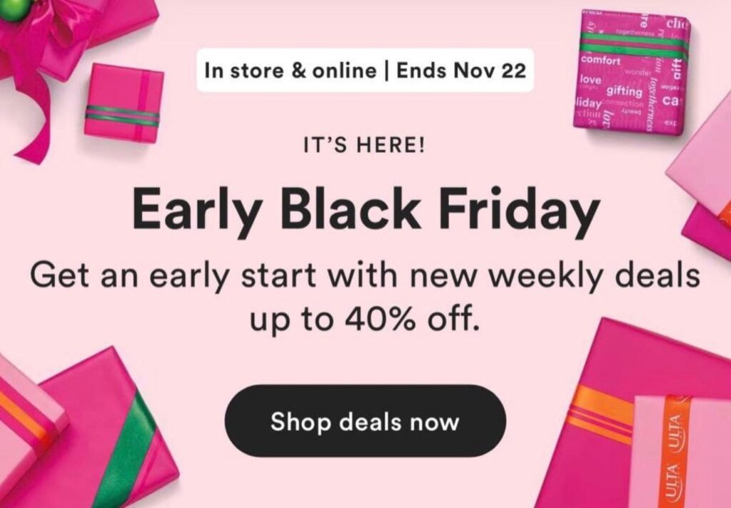 Get ready for Ulta’s Early Black Friday Sale with amazing beauty deals directly from the Ulta website. Save up to 40% off select items and enjoy free gifts with purchases, including a free 17-piece beauty bag with select $90+ orders. This limited-time sale is perfect for stocking up on makeup, skincare, and holiday beauty favorites.