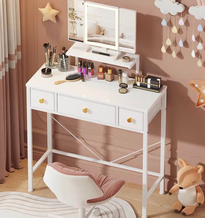 Upgrade your beauty space with this stylish vanity desk with mirror and lights, now available for $65.xx at Amazon, regularly $99.xx. This elegant setup is perfect for makeup, skincare, and daily routines while adding a modern and functional touch to any bedroom or dressing area.