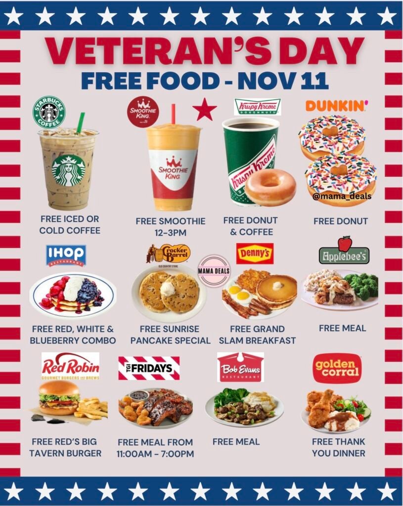 Many restaurants across the U.S. are offering free meals, breakfast, coffee, and desserts for Veterans and Active Duty military on November 11 as a thank-you for their service.