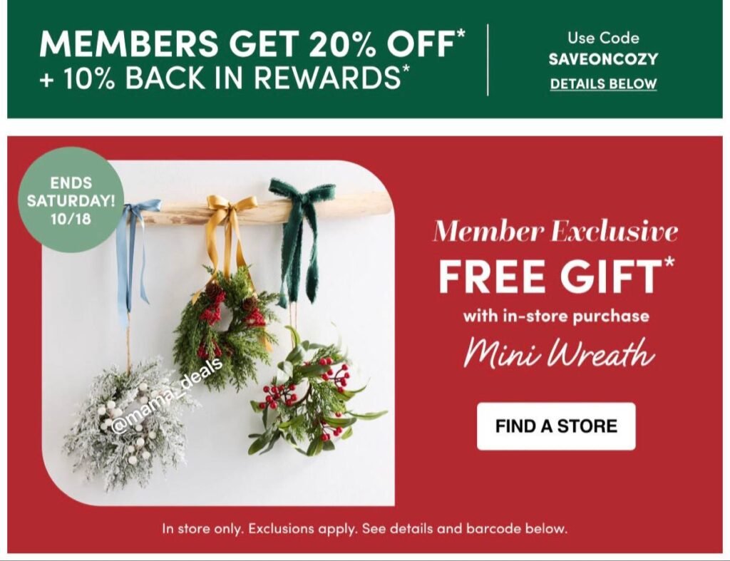 – Offer: Free Mini Wreath with any in-store purchase (member exclusive)
